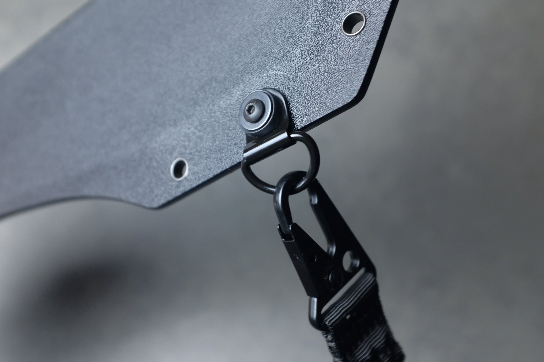 This blade ships with a hand made Kydex sheath with custom D-ring dangler belt carry and shoulder sling strap attachment. This allows for easy over the shoulder carry.